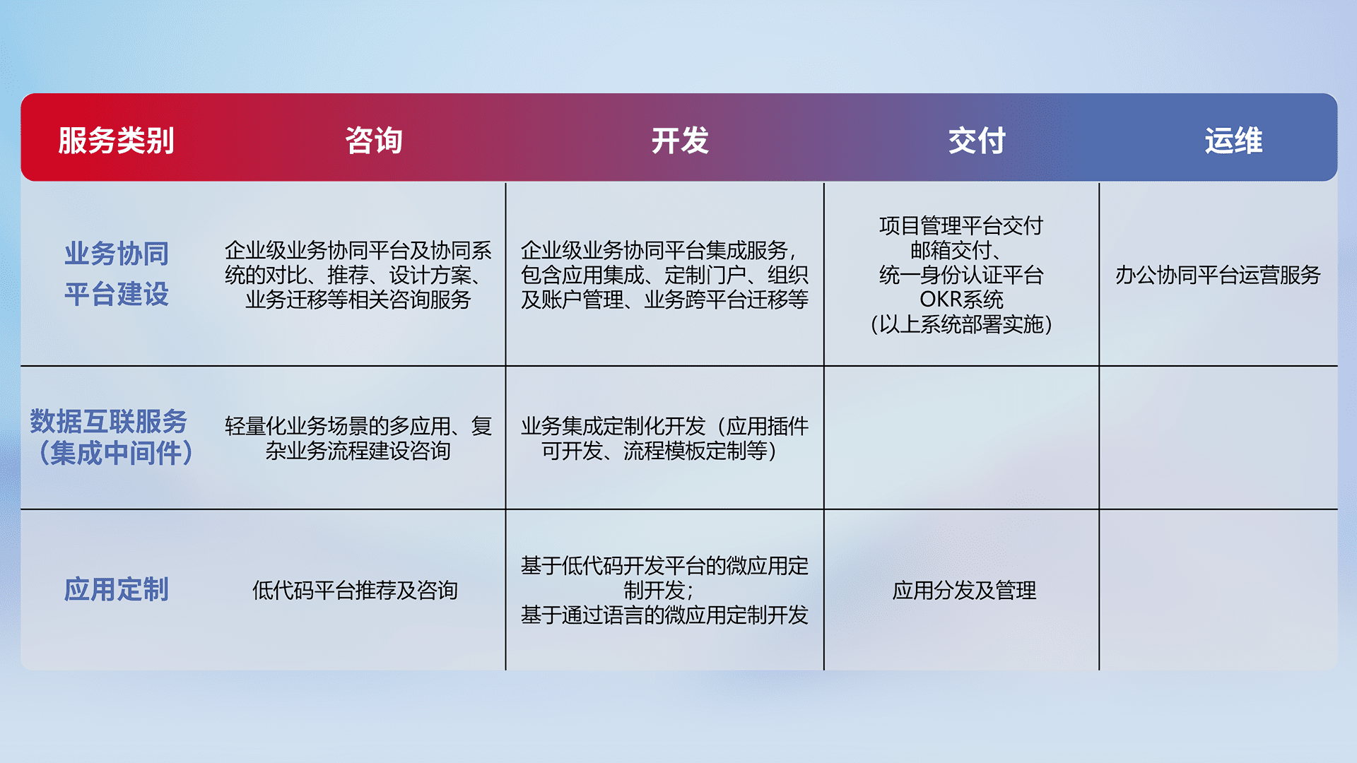 针对钉钉、、、企微、、、IDaas等平台级产品提供产品的规划、、、、方案、、、交付、、、、定制化开发等服务,,实现如统一协同办公、、智能客户服务、、混合会议管理、、智能数据查询、、、等业务场景,,实现数字化转型。。